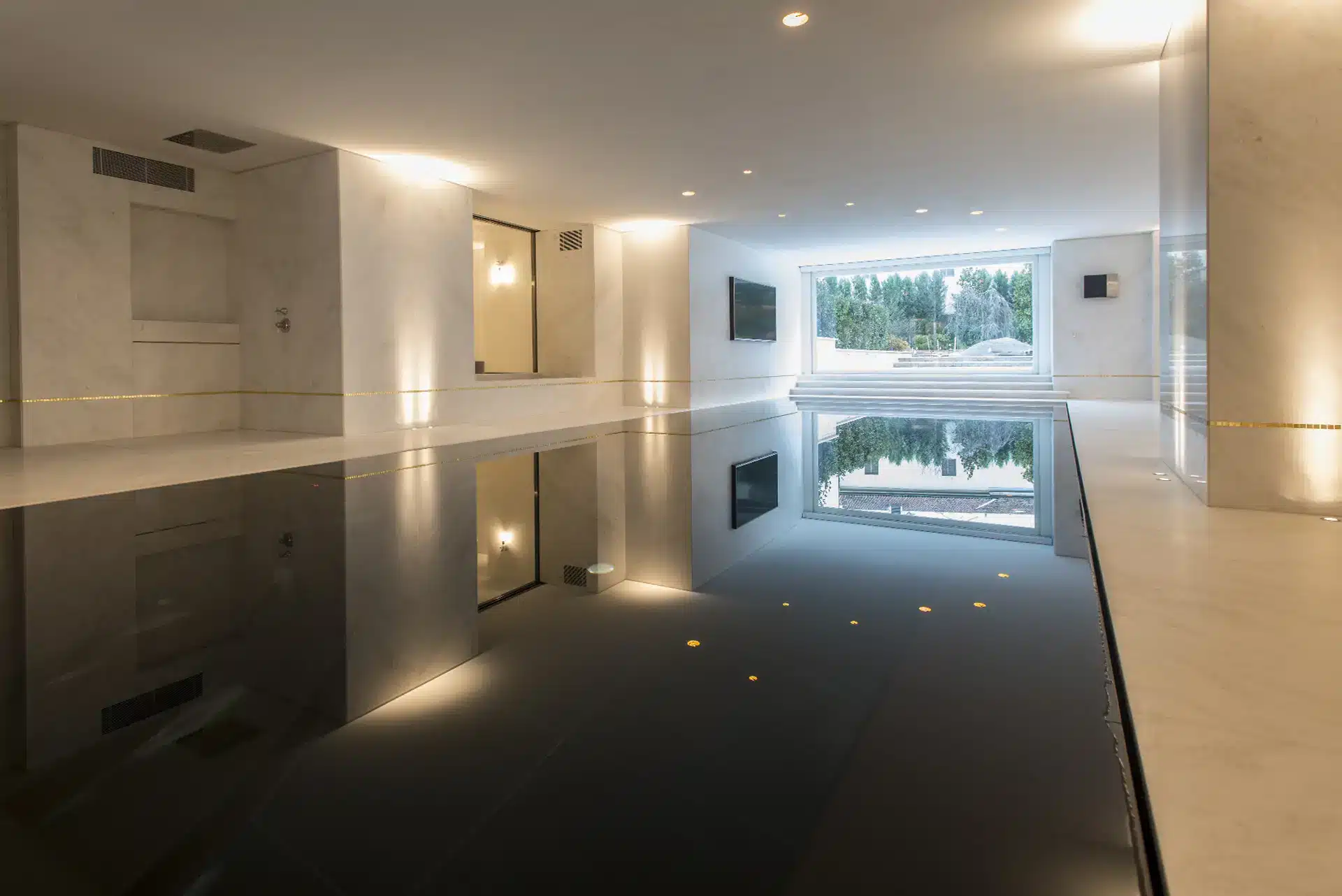 Questa piscina privata si distingue per il suo rivestimento nero, scelto per esaltare il bianco del marmo circostante e creare un effetto scenografico unico. Il risultato è un ambiente moderno, sofisticato e perfettamente integrato nel contesto architettonico.